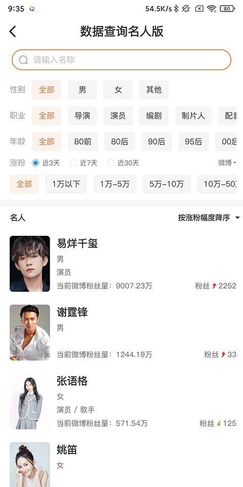8、数据查询名人版:输入你感兴趣的明星名人查看热搜幅度。