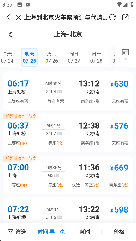 4、系统将展示所有相关车次,根据自己的出行时间和座位需求选择合适车次;