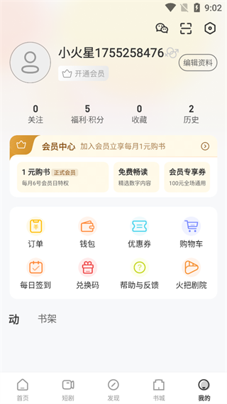 显示个人账号信息,有【订单】【钱包】等功能,可进入会员中心查看权益