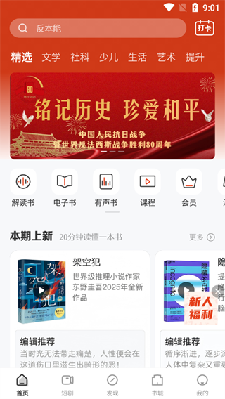 有【解读书】【电子书】【有声书】等功能入口,展示【本期上新】书籍内容