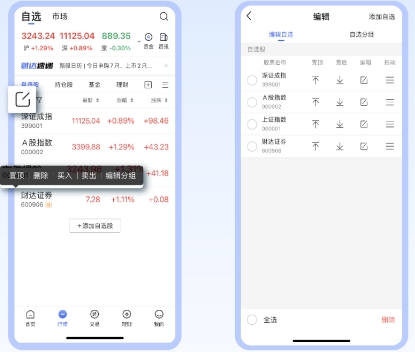 进行置顶、删除、买入、卖出、编辑分组等操作