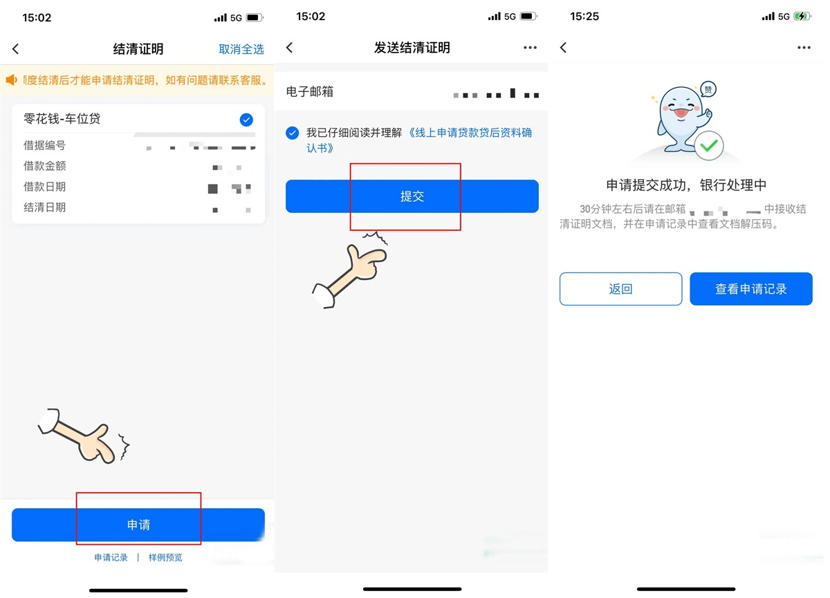 选择已结清的贷款借据,点击申请,输入正确的电子邮箱,勾选我已阅读并理解《线上申请贷款贷后资料确认书》,点击提交,等待申请结果即可。