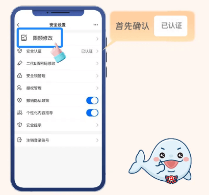 2、首先确认安全认证是否“已认证”未认证需点击进行认证,若已认证则直接点击“限额修改”进入下一步;