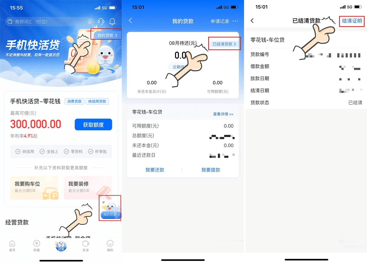 3、通过【贷款】页面,点击“我的贷款”,进入已结清贷款,点击右上角的【结清证明】;或者在【贷款】页面下滑至底部点击【结清证明】即可进入申请贷款结清证明打印页面。