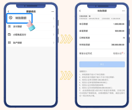 3、限额修改中的“转账限额”为我行电子渠道交易限额,短信认证单笔限额最高50万元,单日最高100万元。