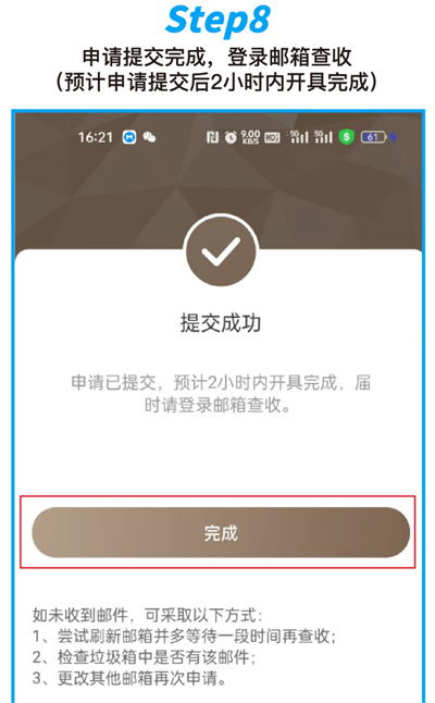 8.申请提交完成,登录邮箱查收(预计申请提交后2小时内开具完成)