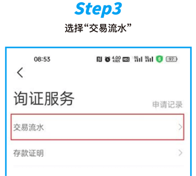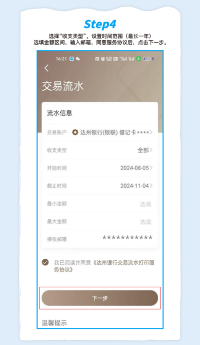 4.选择“收支类型”,设置时间范围(最长一年)。选填金额区间,输入邮箱,同意服务协议后,点击下一步。