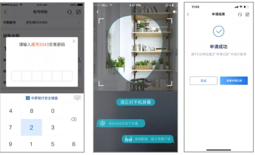 4.用户点击提交按钮,输入交易密码,完成人脸识别跳转至申请结果页面,完成操作。