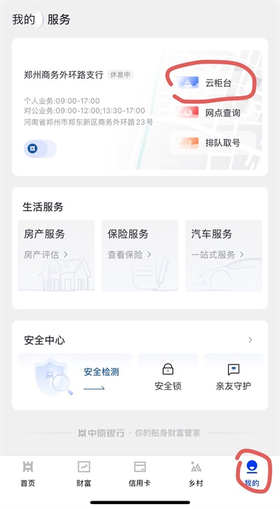 1.下载安装“中原银行”App,登录手机银行,点击“我的”—服务,找到云柜台。
