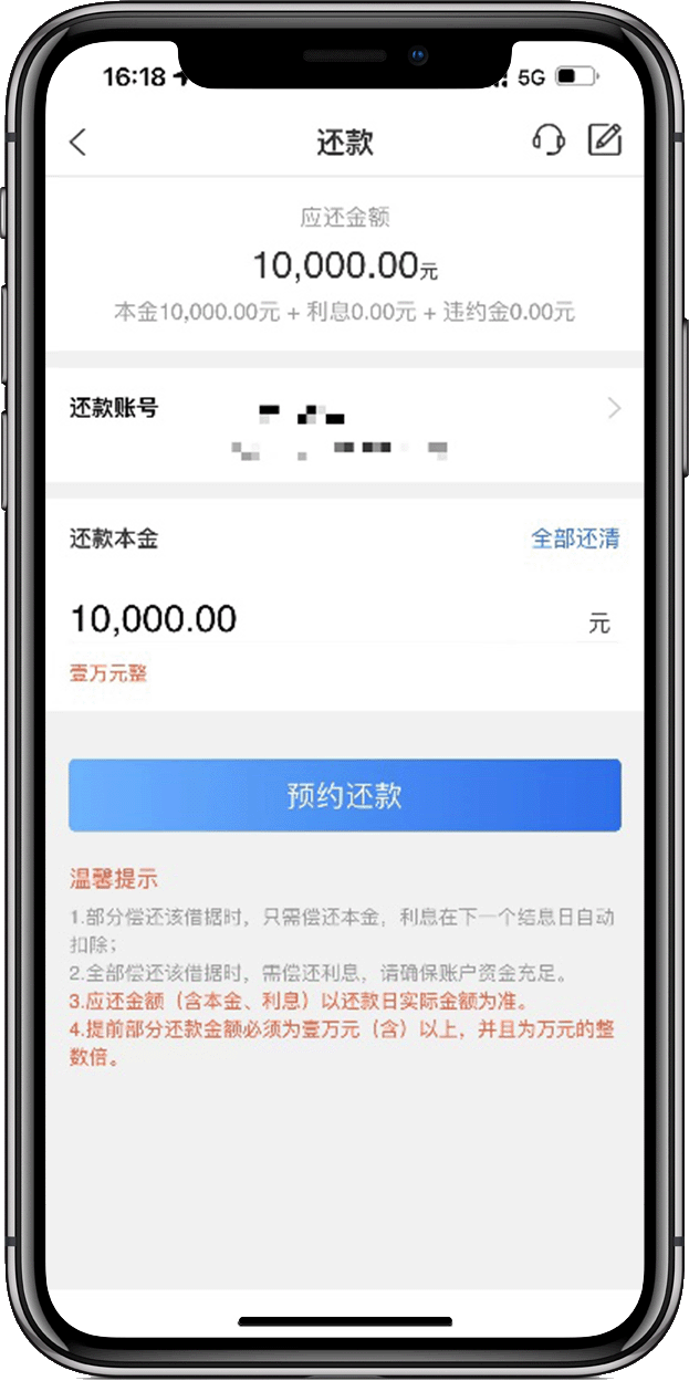 4.在申请页面输入还款本金后,点击“预约还款”,即预约还款成功。