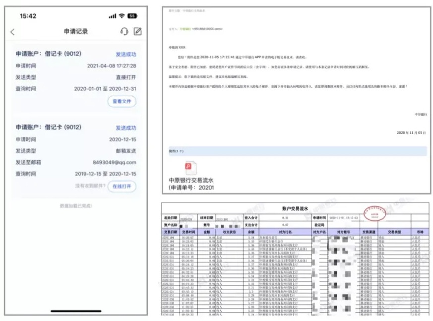 5.交易明细申请成功后,点击查看申请记录按钮进入申请记录页面我行发送邮件用户名为中原银行、头像显示中原银行logo,用户收到的交易流水PDF为加密文档,密码默认身份证号码后六位。