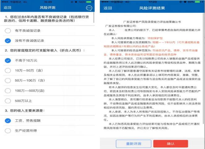 ① 完成22道风险评测题目,完成后阅读“客户风险承受能力评估结果确认书”,点击“确认”进入下一页面;