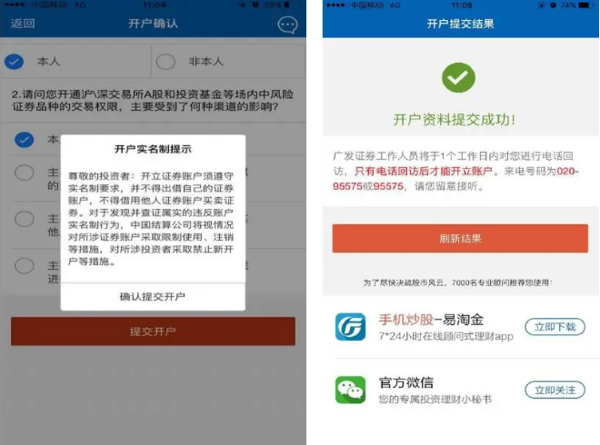 点击“提交开户”,弹出开户实名制提示,需点击“确认”后,才能提交开户申请。提交成功后,可以看到提交成功的提示;客户需要接受电话回访成功后才能激活账户。