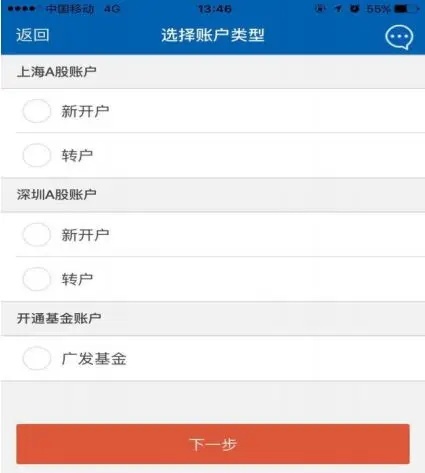 ② 必须选择开通或转入一个账户类型,否则点击“下一步”无法继续开户。