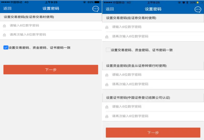 ④ 如果去掉勾选框,则须单独设置交易密码、资金密码和证书密码。