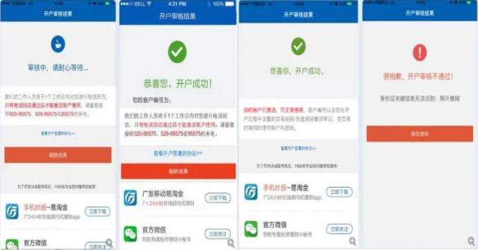 ①提交开户申请后,再次通过手机号码登录进来,可以看到开户的结果:审核中、审核通过等待回访、开户成功、开户失败;