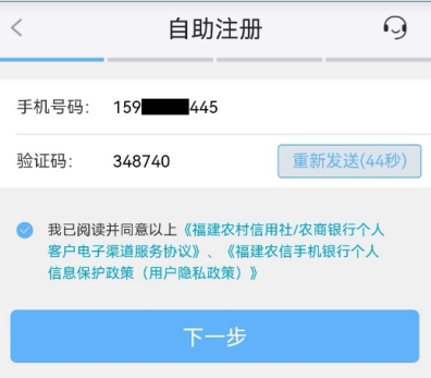 ②.用户点击手机号注册,进入手机号码填写页,输入注册手机号,点击获取验证码(验证码有效期为2分钟),输入6位短信验证码。点击协议确认协议内容后选择我已阅读并同意协议内容,点击下一步。