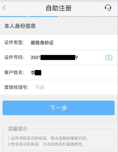 ③. 在客户身份信息录入页面,点击右边的照相机图标,页面跳转ocr识别,用户使用手机后置摄像头扫描身份证正面,页面自动识别身份证号码与姓名,并回填在页面上,用户输入经销经理号(可以不填),点击下一步。