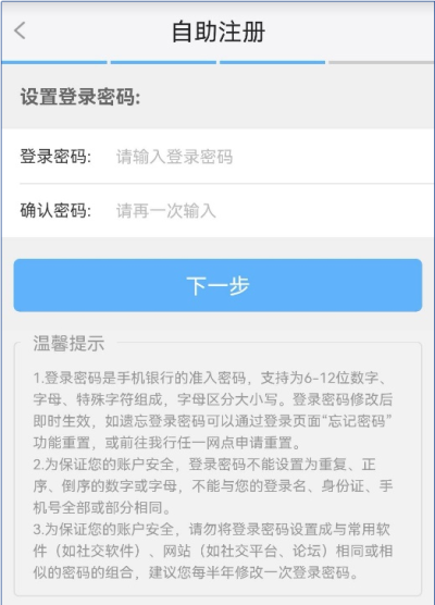 ⑤.用户完成人脸识别,在登录密码设置页面设置登录密码,点击下一步,即可完成注册。