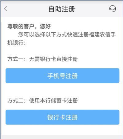 ①未签约用户进入登录页面,点击“自助注册”进入自助注册首页用户可选择方式一:无需银行卡直接注册->手机号注册;或选择方式二:使用本行储蓄卡注册->银行卡注册。