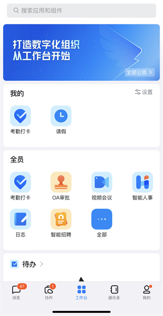 提供考勤、签到、审批、日志、公告、请假、报销、出差等oa功能,满足企业日常办公需求,同时全面支持接入企业自定义应用,让工作更简单。