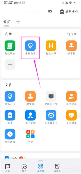 1、打开钉钉,点击“工作台”。来到“工作台”页面,在“智能人事”一栏点击“考勤打卡”。
