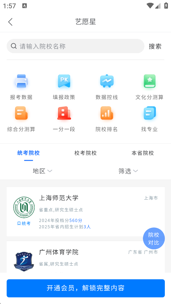 a.根据不同条件,可搜索、筛选招考院校