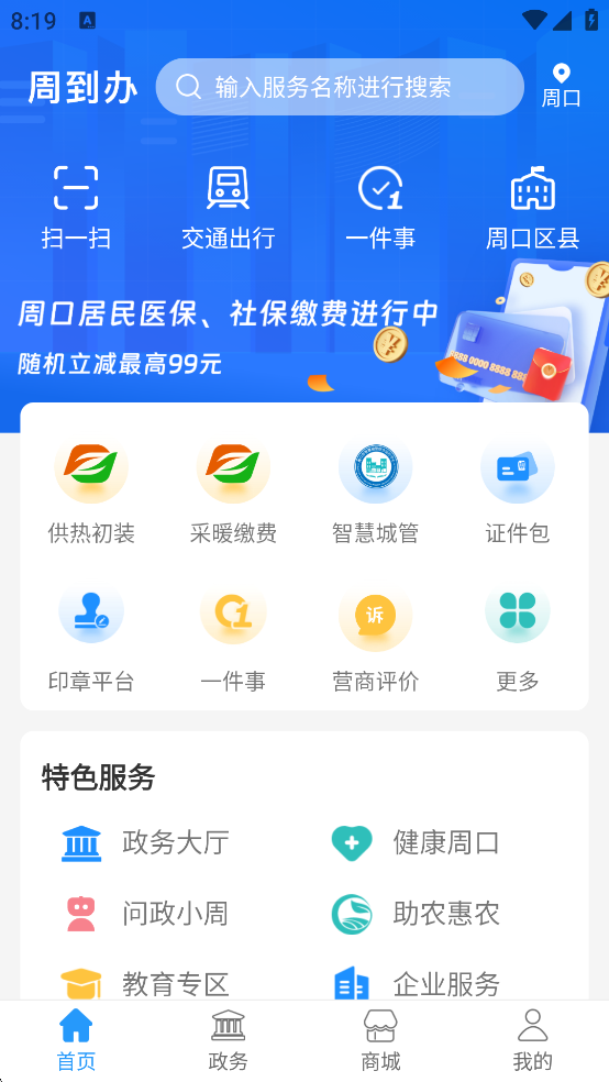 周到办App是周口市政府推出的政务服务“一网通办”移动客户端,通过大数据、云计算、人工智能等前沿技术,将多种应用加载到一个APP上,打造全市统一的移动便民服务平台,为周口本地居民提供政务服务、综合治理服务、公共服务、医疗服务和金融服务等五大服务,足不出户就能全方位的享受移动便民生活服务。有了周到办App,用户就能够随时随地办理如公积金、社保、电子健康卡等多种生活服务,为用户带来巨大的便利,节省更多的时间,有需要的朋友欢迎下载体验!