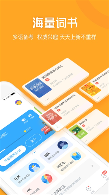 可添加词书开启学习,还能参与任务、组队、PK 等活动,也可借助精选词书以游戏的方式练习口语