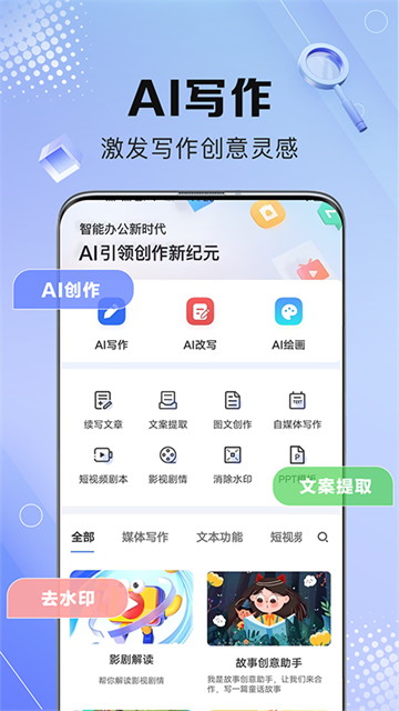 支持PPT大纲生成,工作总结,公文助手,发言稿,日报周报月报,日程计划等功能,打工人效率神器。