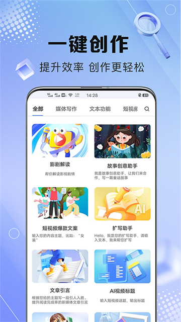 输入关键词,一键智能生成文案。支持教案设计,工作总结,日报,周报,新媒体文章、短视频脚本、电商产品描述、营销广告,活动策划等功能,提高工作效率。