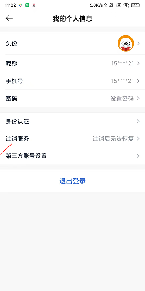 2、选择“注销服务”:在个人信息页面,找到并点击“注销服务”选项。这个选项通常与其他个人信息管理选项(如修改密码、绑定手机号等)放在一起。