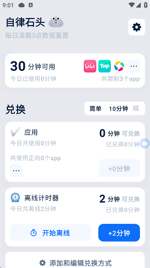 用户设置好App使用时间后,需要减少使用的App默认每天 10 分钟使用时间,时间耗尽会提醒,并且没有办法继续使用这些软件;这个时候为了解锁更多时间,你可以选择站起来走走、阅读看书、学习专注、使用正向 App 来兑换更多使用时间,如果想要玩更多手机,就去坚持做这些好习惯,可以帮助你慢慢戒手机,更加循序渐进的控制手机瘾。自律石头App最新版还支持强大的数据统计功能,后续还会持续更新更多实用功能。