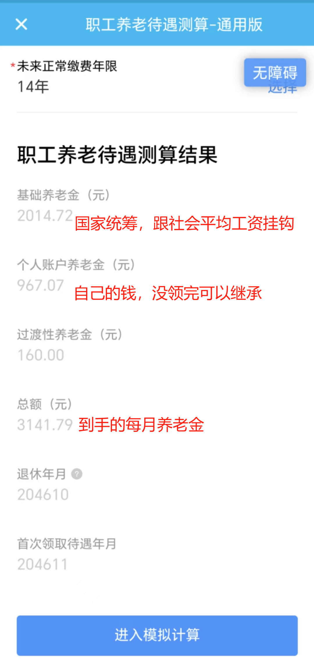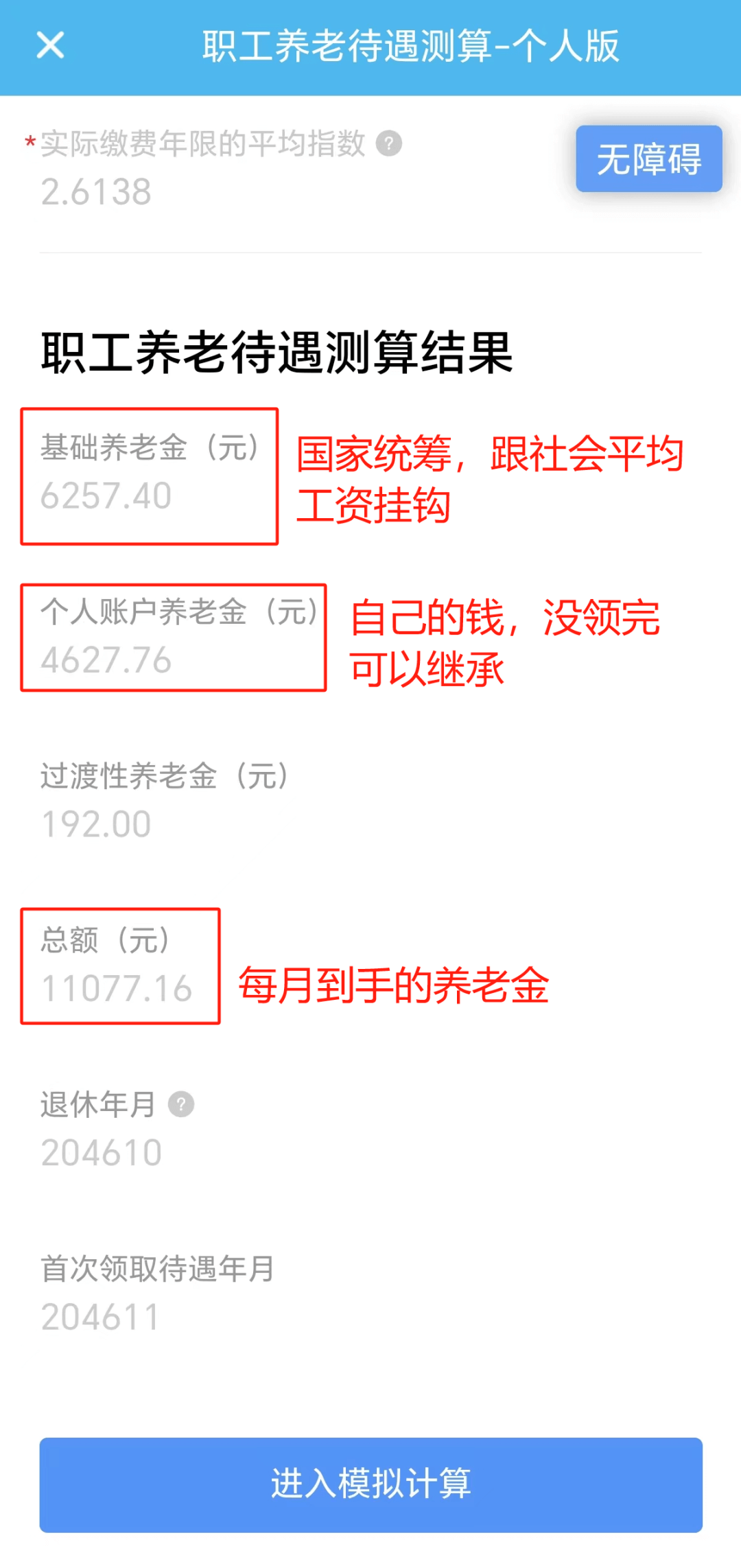 3.填完之后点击【进入模拟计算】,就能看到测算结果了: