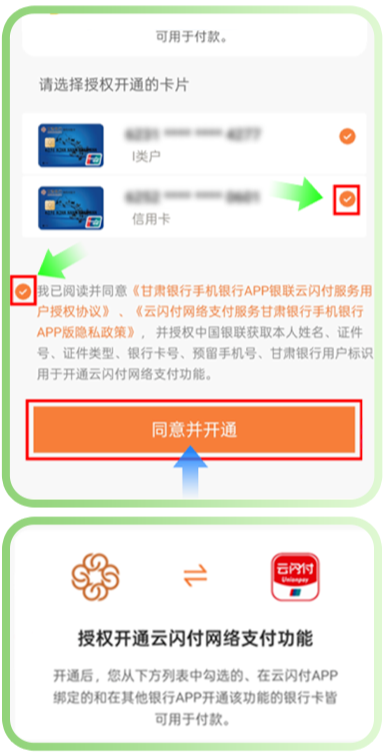 3、首次使用请勾选卡片和“我已阅读并同意”,授权“同意并开通”云闪付网络支付功能