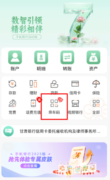 1、打开甘肃银行手机银行,点击“乘车码”