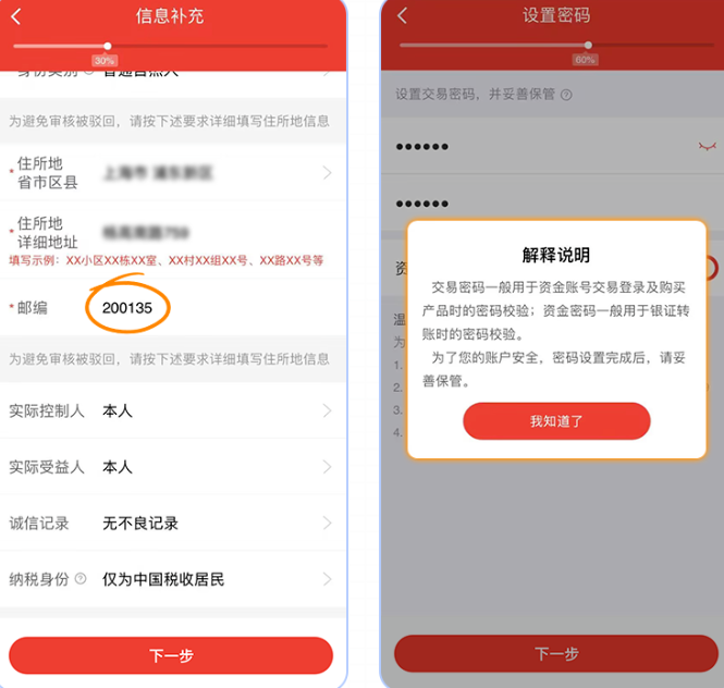 2、输入住所地地址后自动带入邮编;增加资金密码和交易密码的说明。