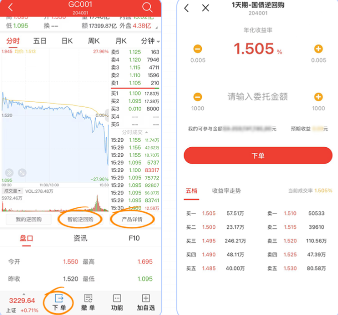 2、国债逆回购个股行情页升级,点击“产品详情页”“下单”、“智能逆回购”、均可一键带入代码分别进入逆回购专区产品详情页和智能逆回购条件单。