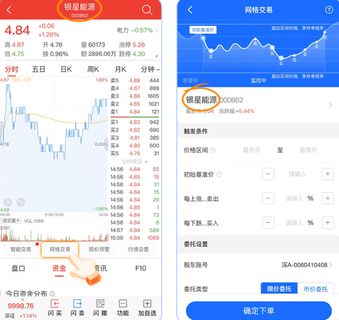 1、从个股行情页跳转条件单策略(如网格交易),可一键带入个股代码,方便快捷创建条件单。