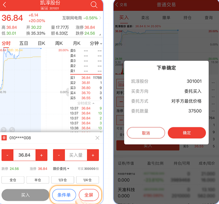 3、个股闪买闪卖功能新增“智能条件单”和“全屏”去“买入”或“卖出”)快捷跳转;市价委托的确认弹框新增委托方式展示