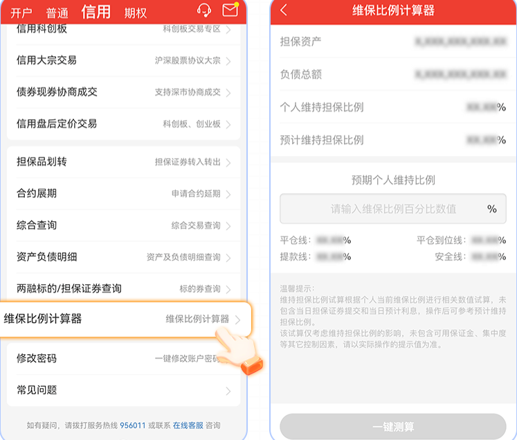 信用交易维保比例计算器,可一键试算两融账户相关资产数值。