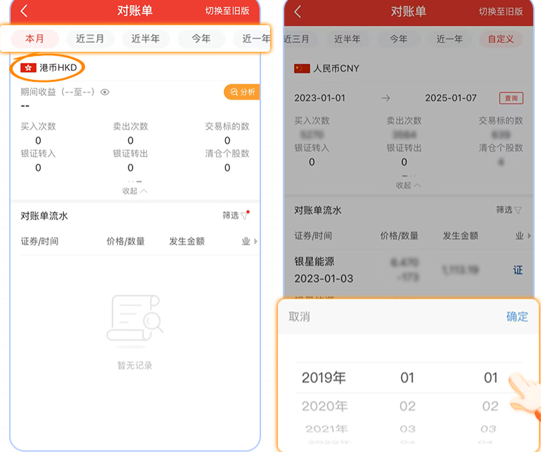 支持人民币、美元、港币多币种切换;新增本月近三月、近半年、今年、近一年各区间统计,自定义查询时间跨度不再设限(可查询从2019年1月1日至今的所有明细)