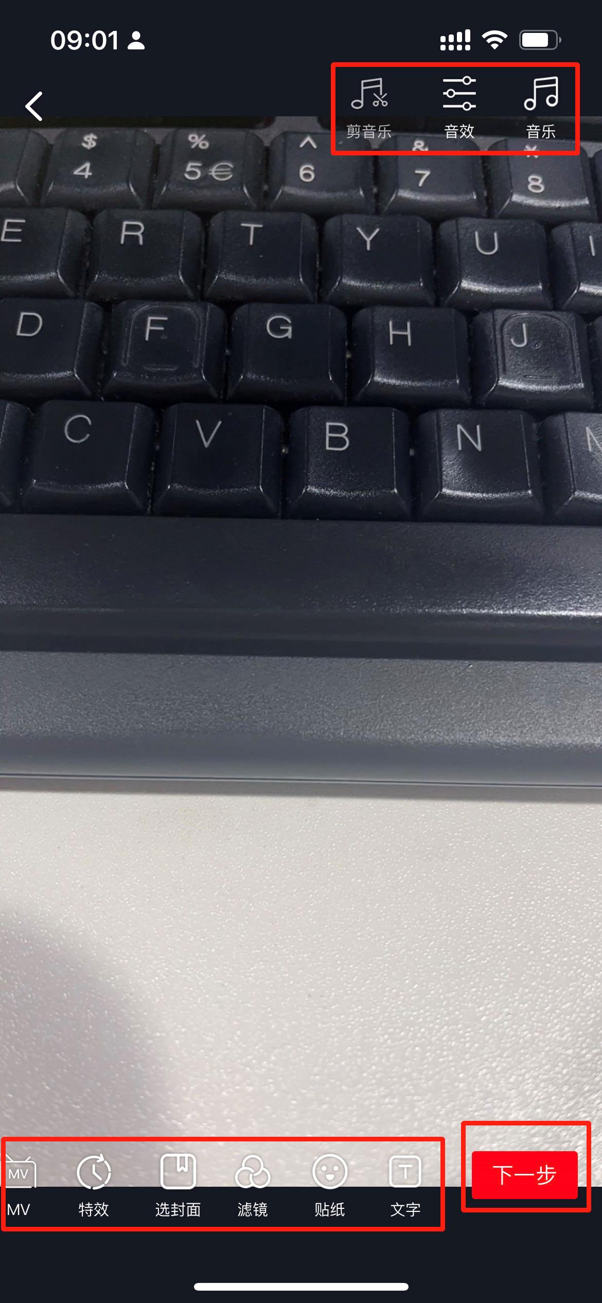 拍好之后可以依据个人喜好,给视频稍微剪辑一下,添加背景音乐特效、滤镜、贴纸、文字等,然后点击下一步;
