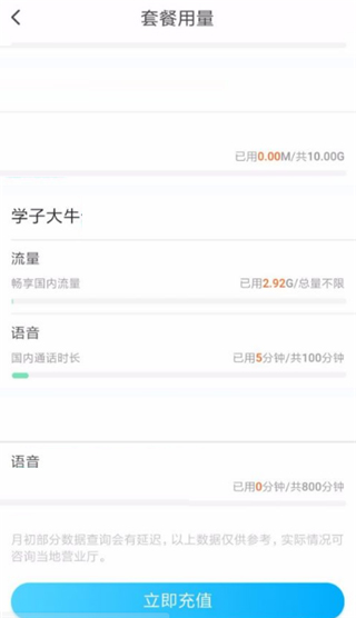 5、这里就可以看到你每个月的具体套餐情况,如果使用超标,还可以立即进行充值