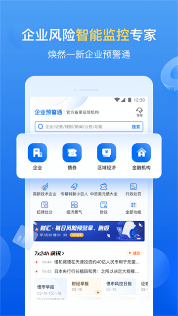 v8.4.2企业预警通是一款以大数据与人工智能为核心驱动的企业风险监控平台,能够实现对千万级企业及其关联方的全景化风险预警。软件功能覆盖企业负面新闻、诉讼、公告、诚信事件、股东及供应链风险穿透、债券深度数据与信用市场研究等多个维度。用户不仅能获得详细的企业概况与财务数据,还可以通过自定义风险因子,第一时间接收预警推送,真正做到“未雨绸缪”。通过企业预警通,用户能够在瞬息万变的市场中抢占信息先机,规避潜在风险,把握更大确定性。