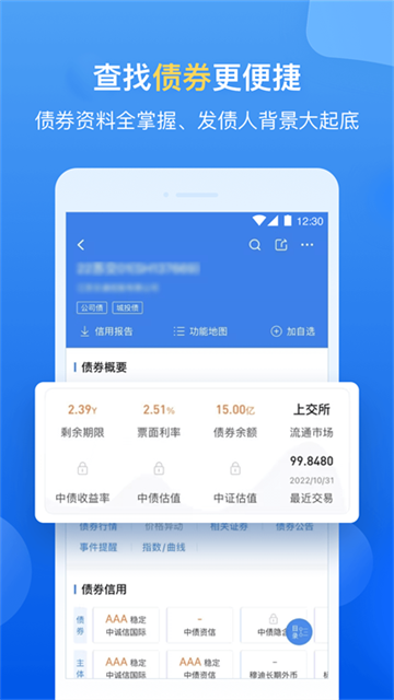 展示债券的详情信息,包括债券要素、债券发行、债券评级、债券估值、事件提醒、债券公告、相关证券、机构持仓等内容。