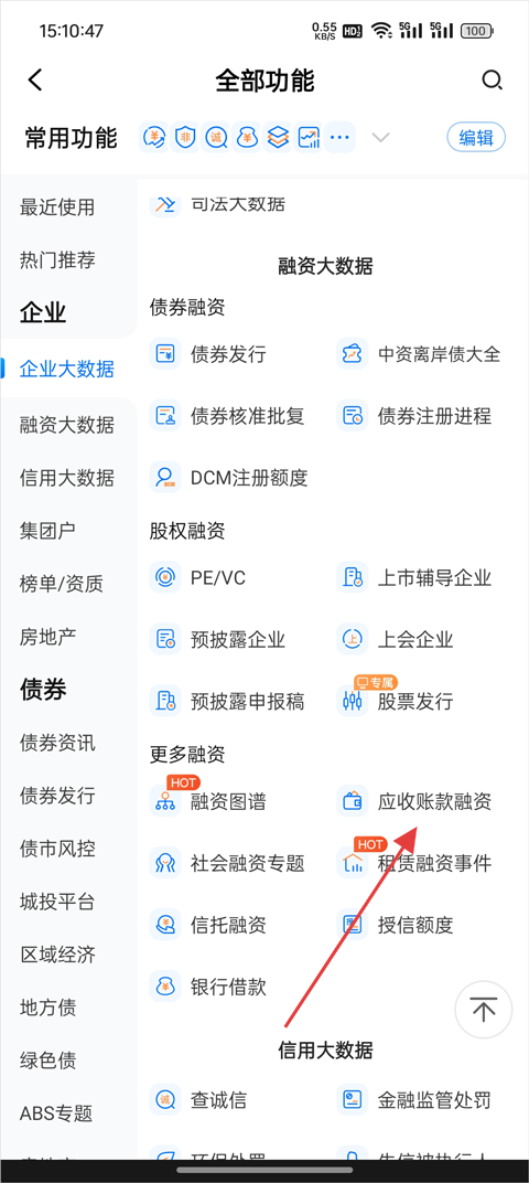 2、在【企业】板块中向下滑动,找到【应收账款融资】入口;