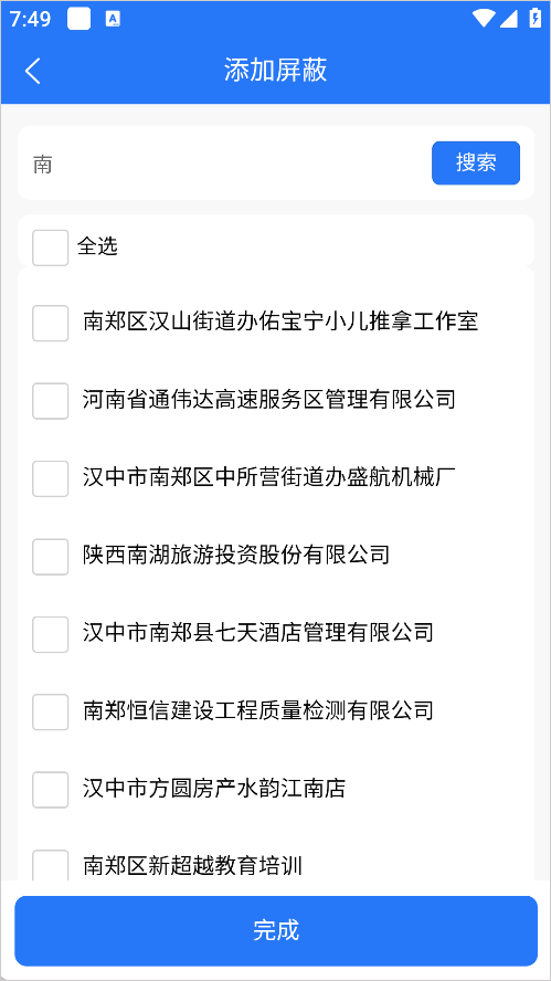 3、在搜索框中输入企业名称,勾选后点击完成即可