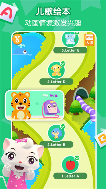 26个字母单元、16+高频词组、200+英文单词、44首英文儿歌、16+互动游戏,分阶段对字母和单词进行专项学习。以认、说、写、练的方式学习字母,更有儿歌和闪卡的结合,轻松学习常用高频词汇。