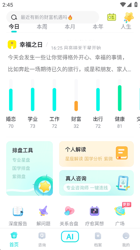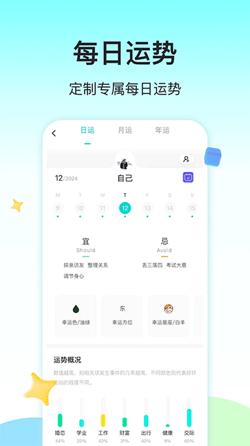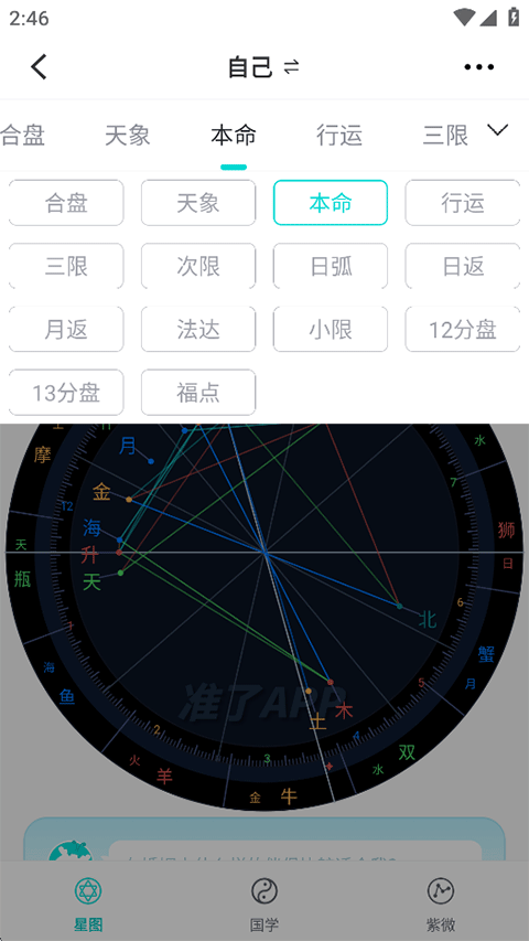 v3.1.0准了App是一款融合心理学与天文学理论的星座兴趣社交软件,旨在为用户提供专业的星座运势解读和情感预测服务。平台基于用户生辰信息生成个人星盘档案,提供日运、周运、月运及年运等不同维度的运势分析,涵盖情感、财富、禁忌等多个生活场景,同时还能推荐幸运城市和匹配理想伴侣。